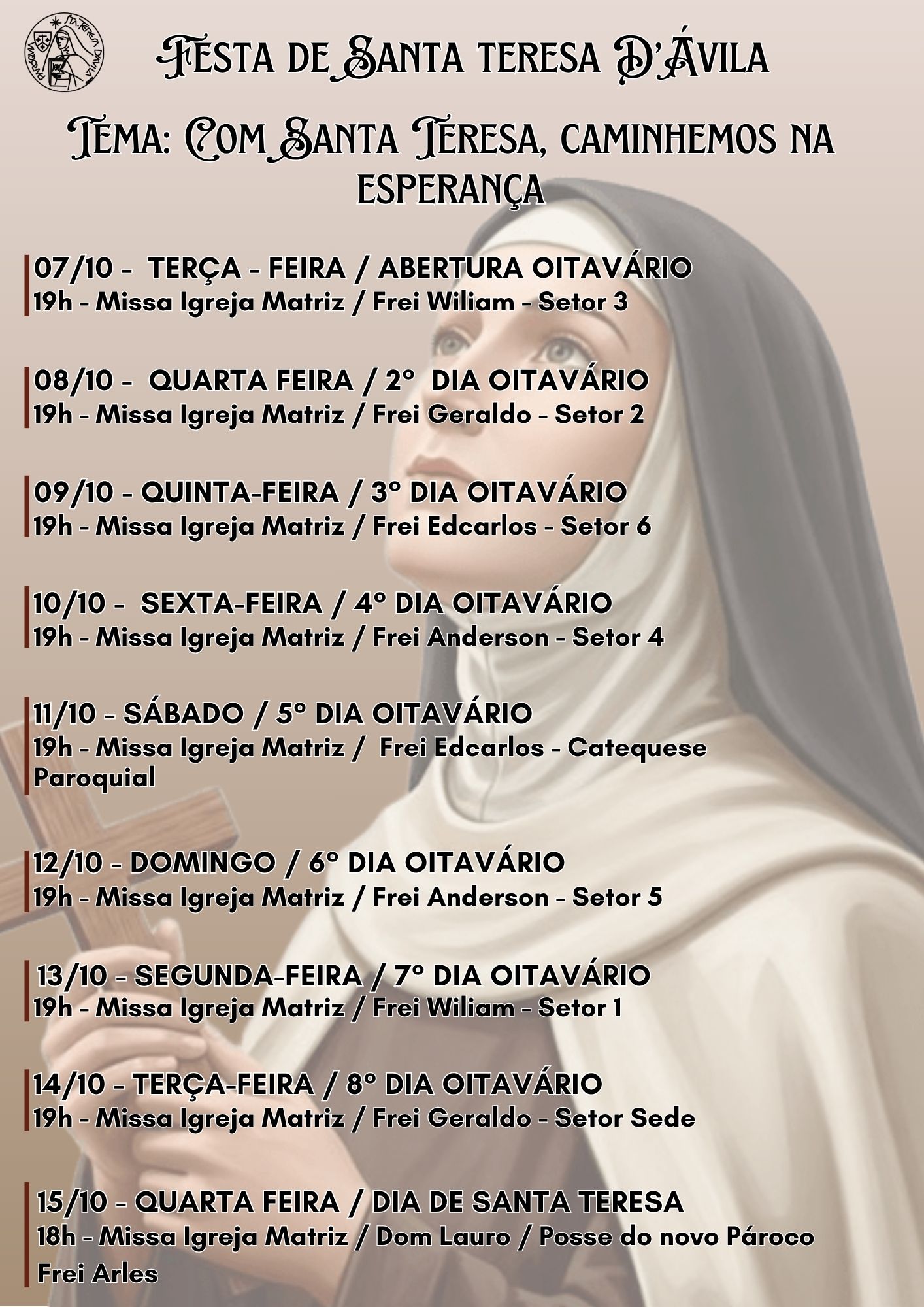 O Oitavário culmina na quarta-feira, 15 de outubro, dia litúrgico de Santa Teresa D’Ávila. A Missa festiva será celebrada às 18h, presidida por Dom Lauro Sérgio Barbosa Versiani, bispo diocesano, e marcará também a posse oficial do novo pároco, Frei Arles Dias de Jesus.
